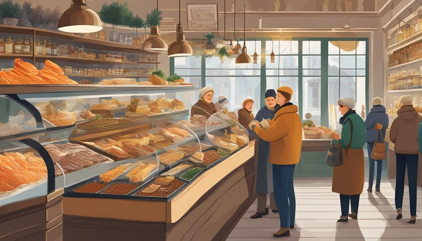 Russian specialty shops are well-known for their selection of smoked fish and caviar. Visitors often find items like cold smoked mackerel and salmon kept fresh behind glass counters or in refrigerated cases.